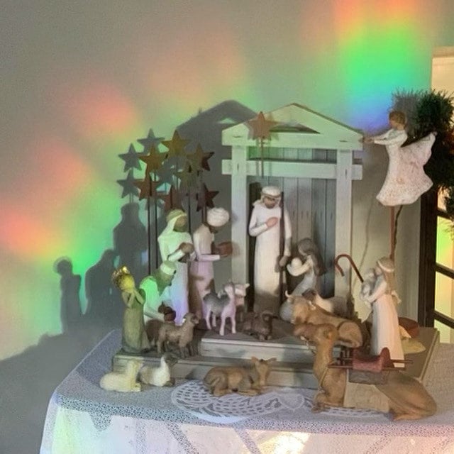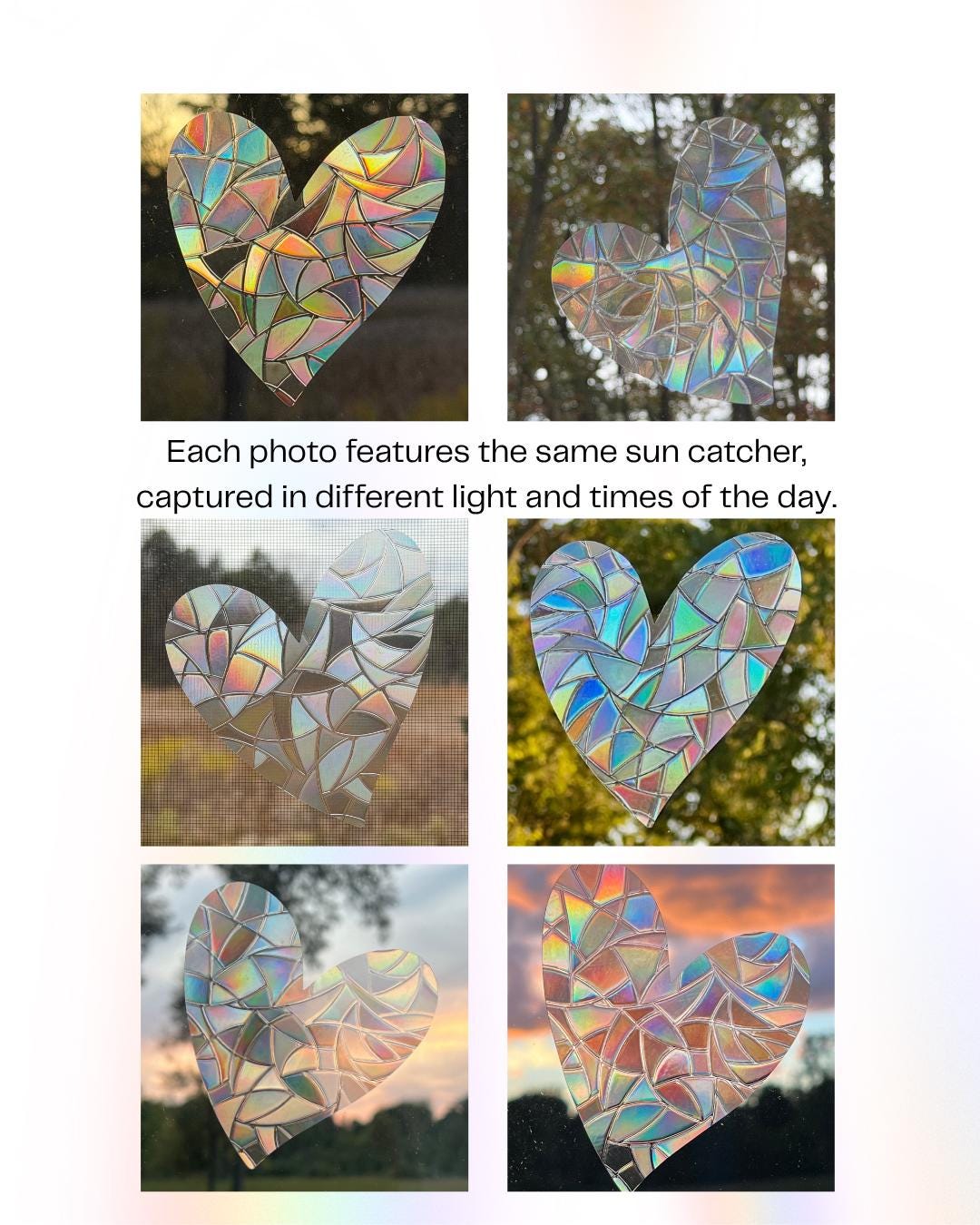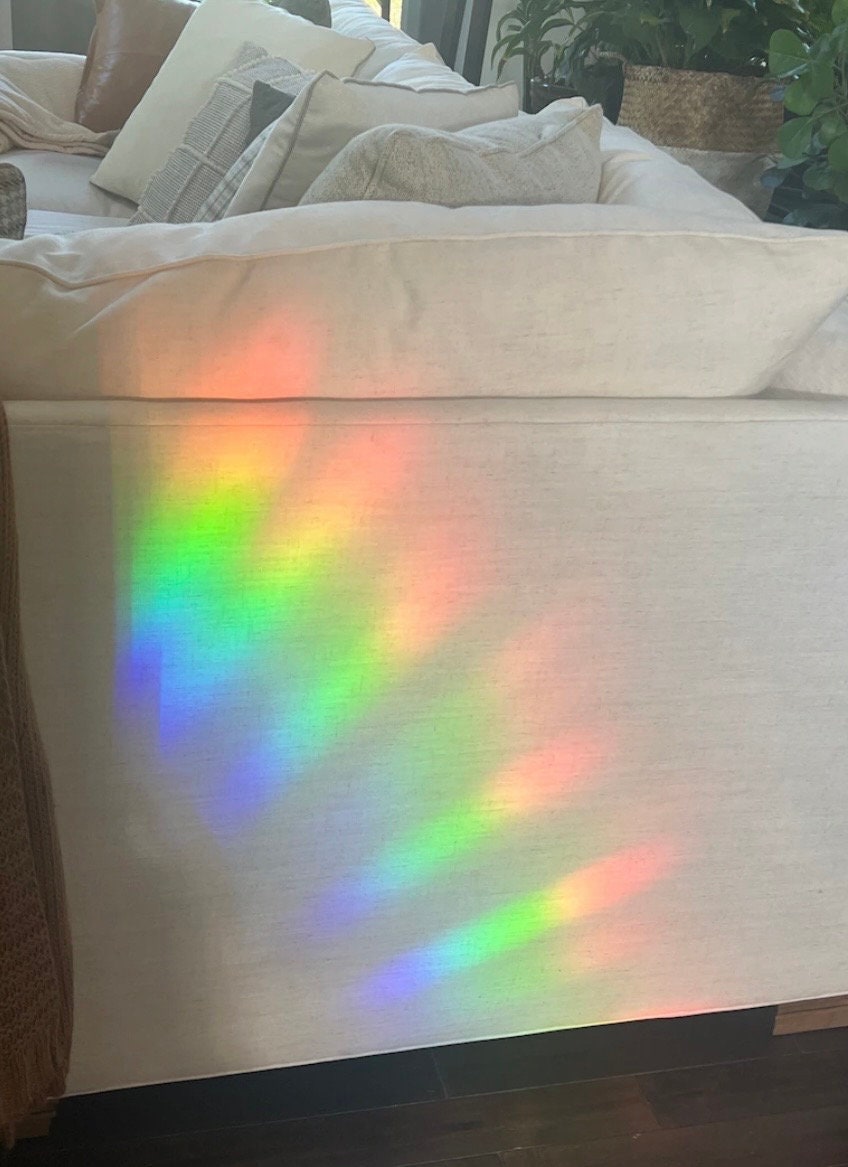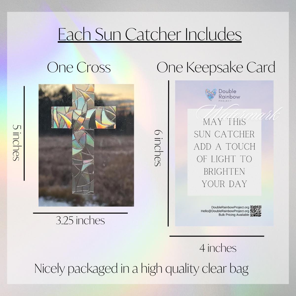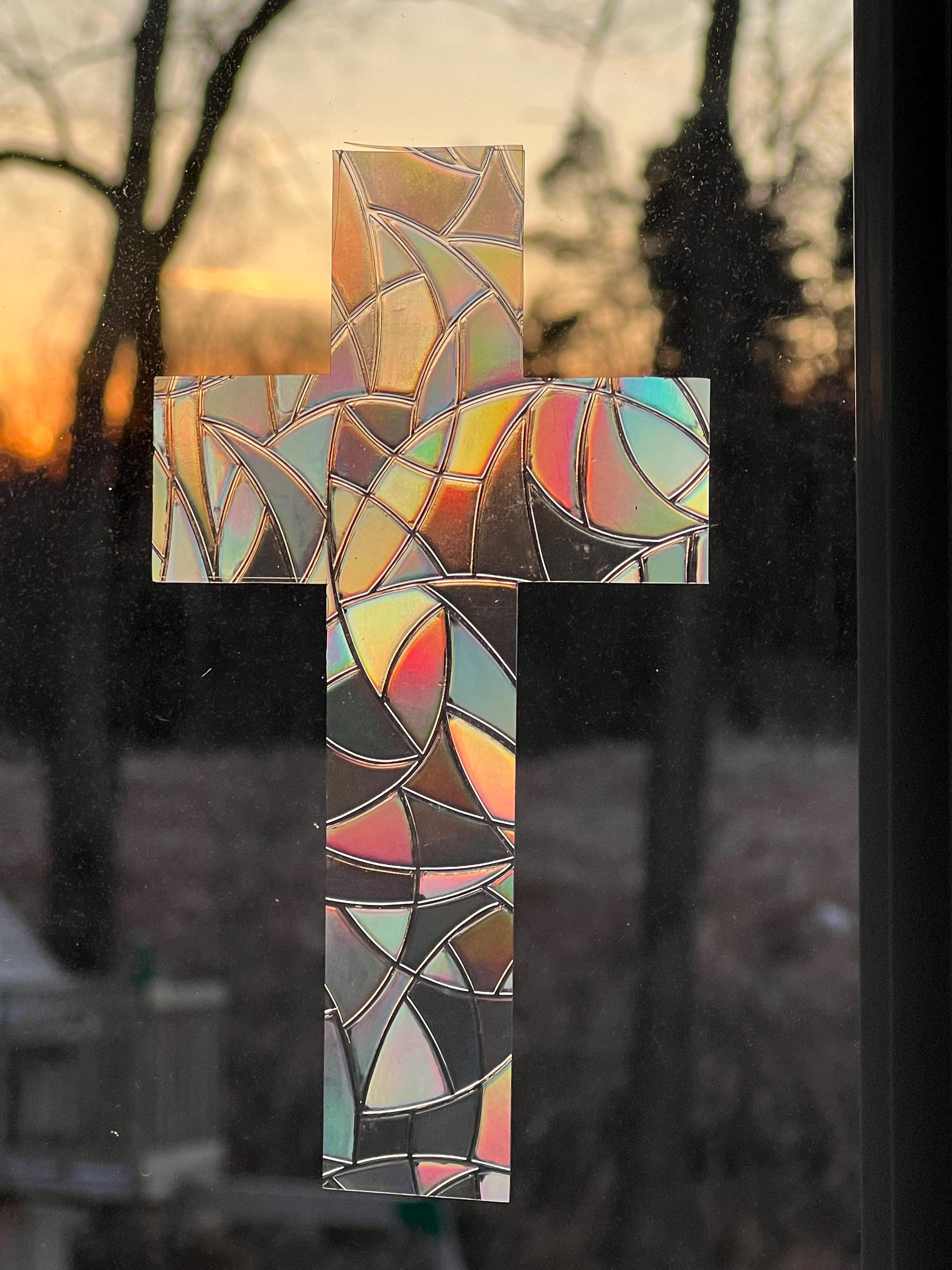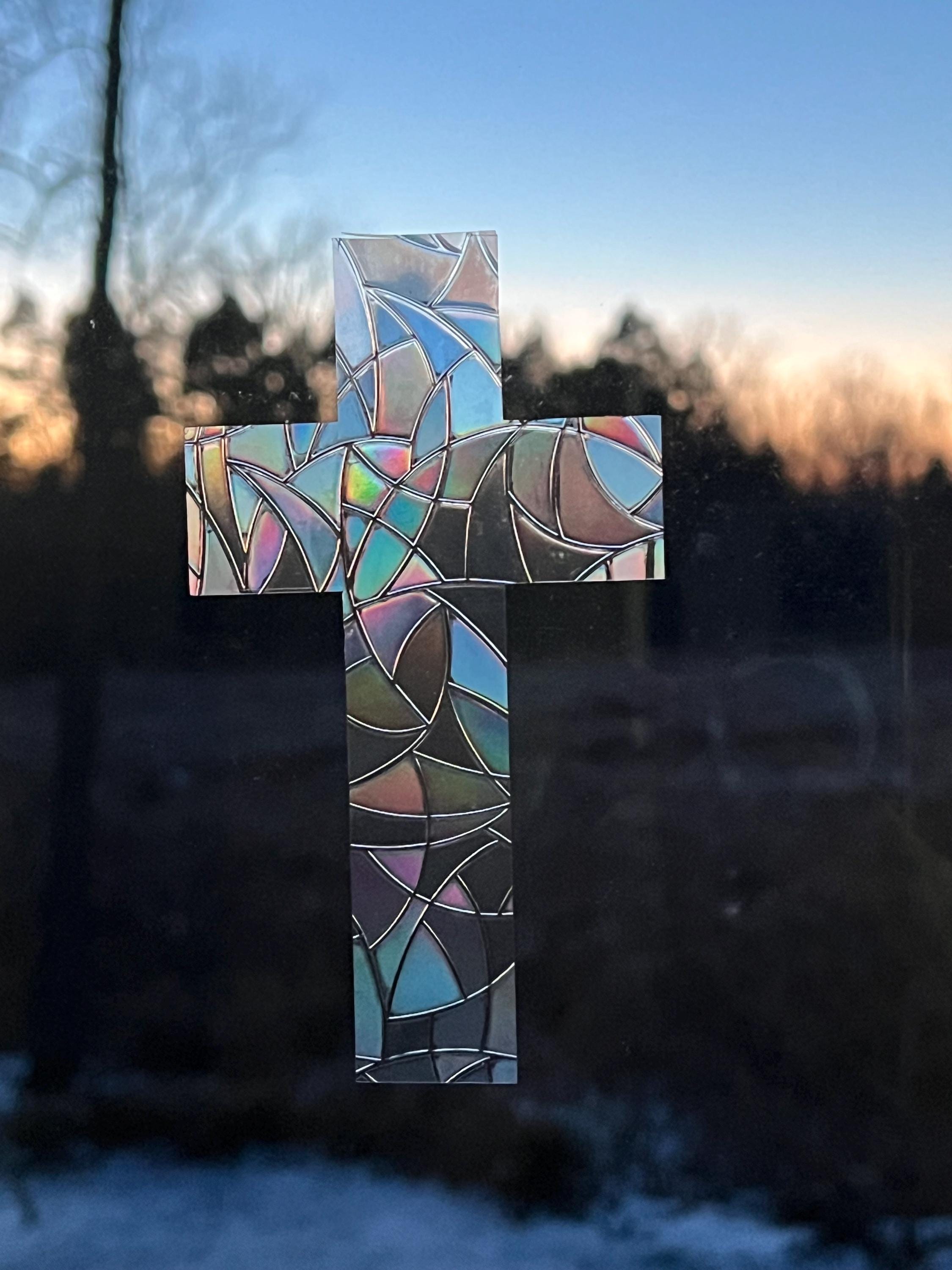 This is a reusable cross sun catcher made from translucent prismatic vinyl. When sunlight passes through, it creates colorful rainbow reflections.