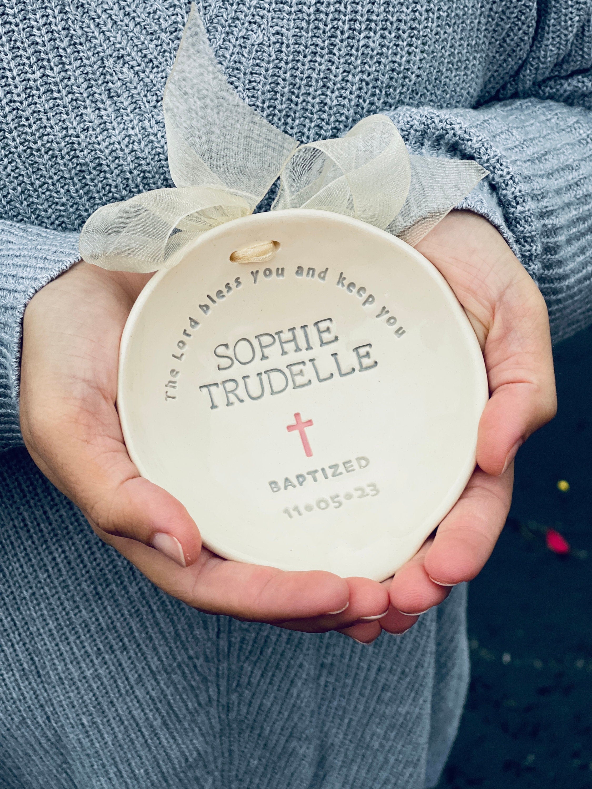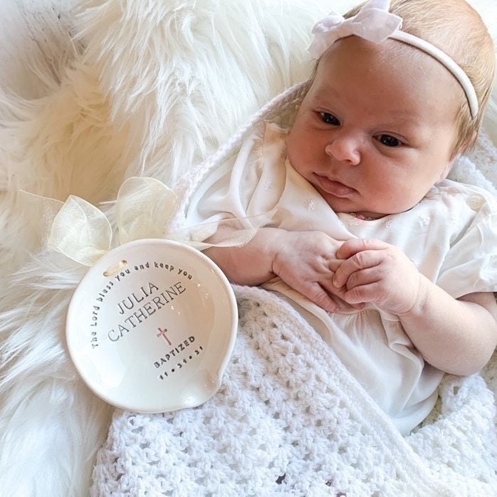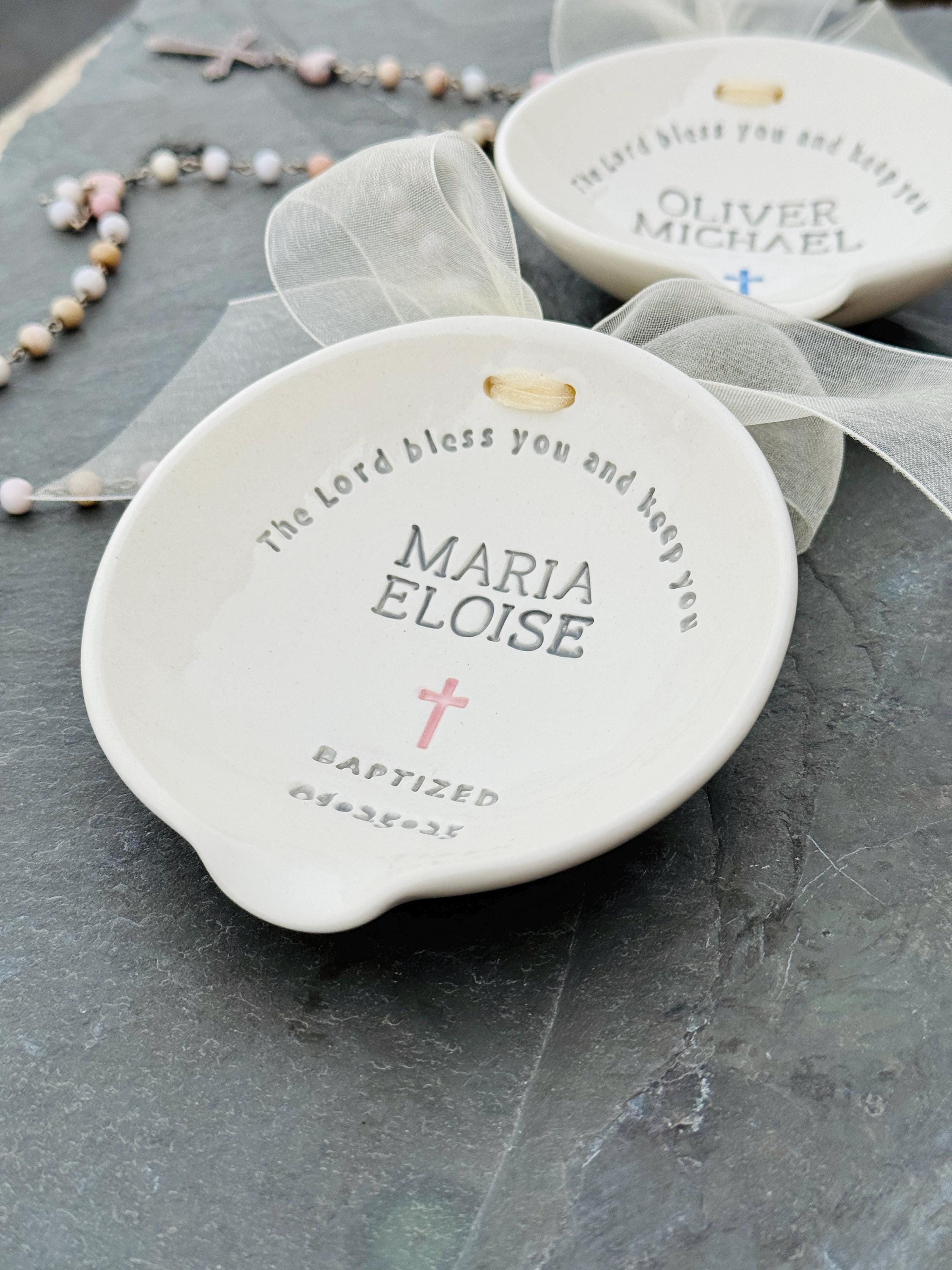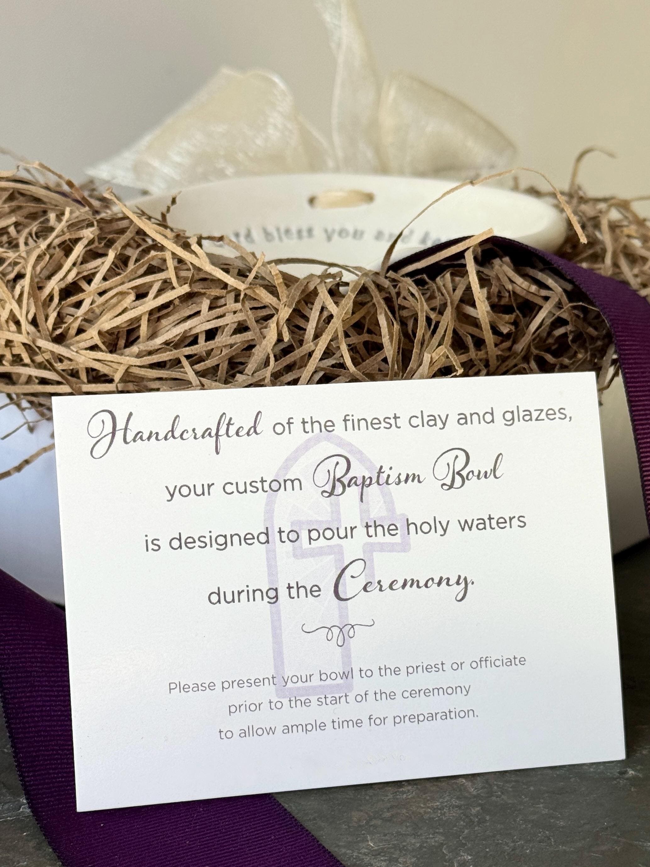 This is a personalized ceramic Holy Water Baptism Bowl, handcrafted in our studio. It is designed for use during the baptism ceremony and as a keepsake afterward.