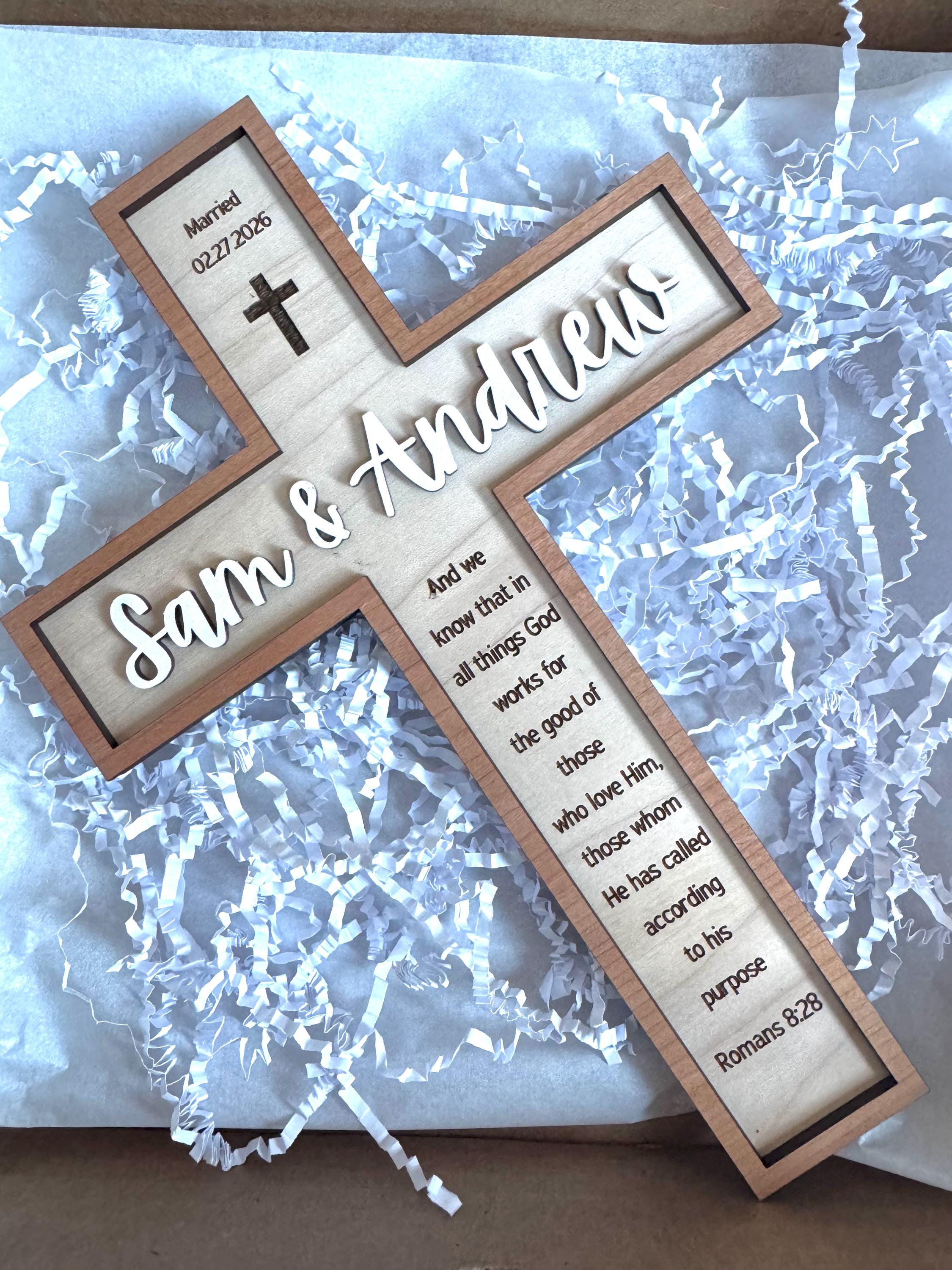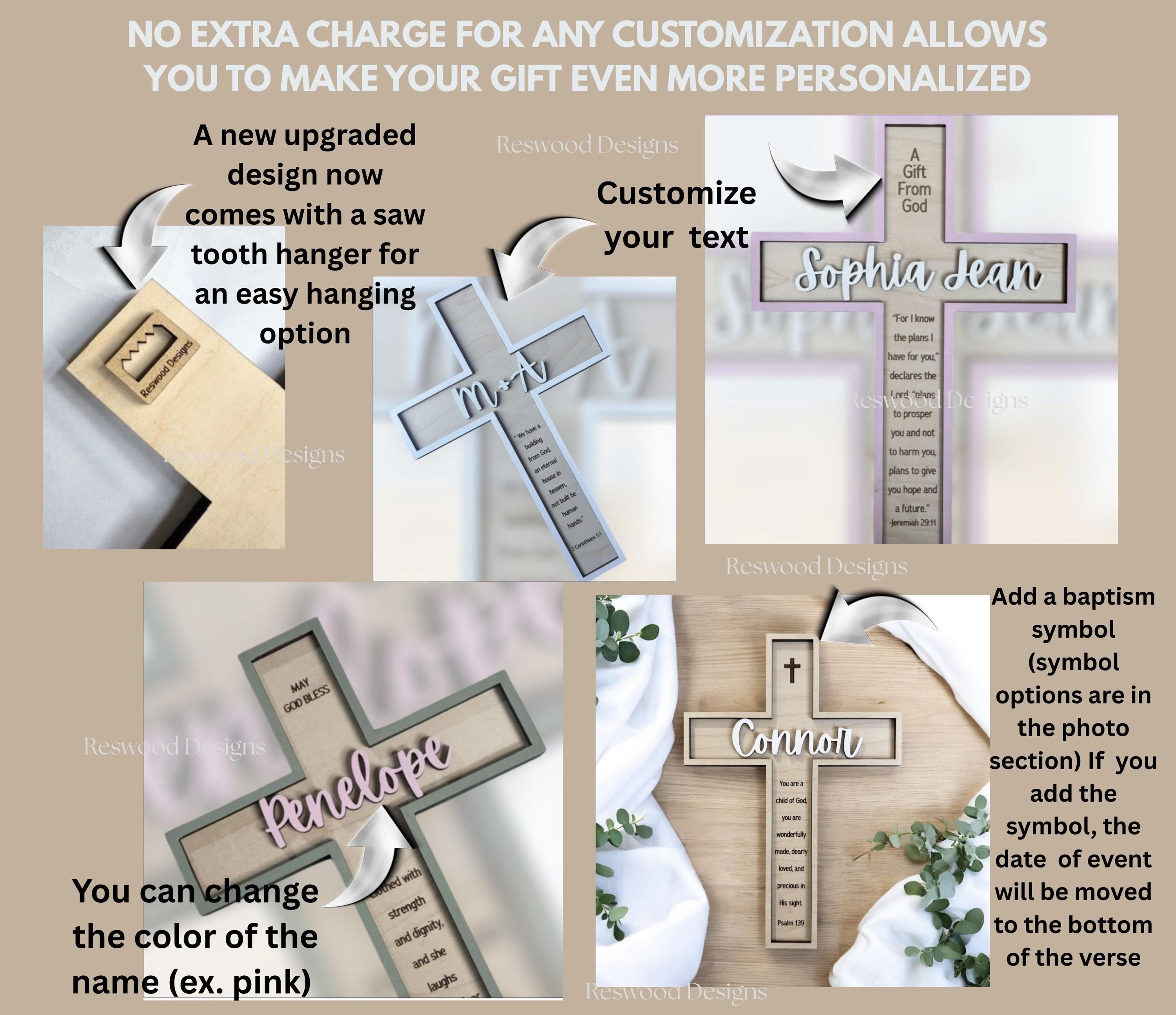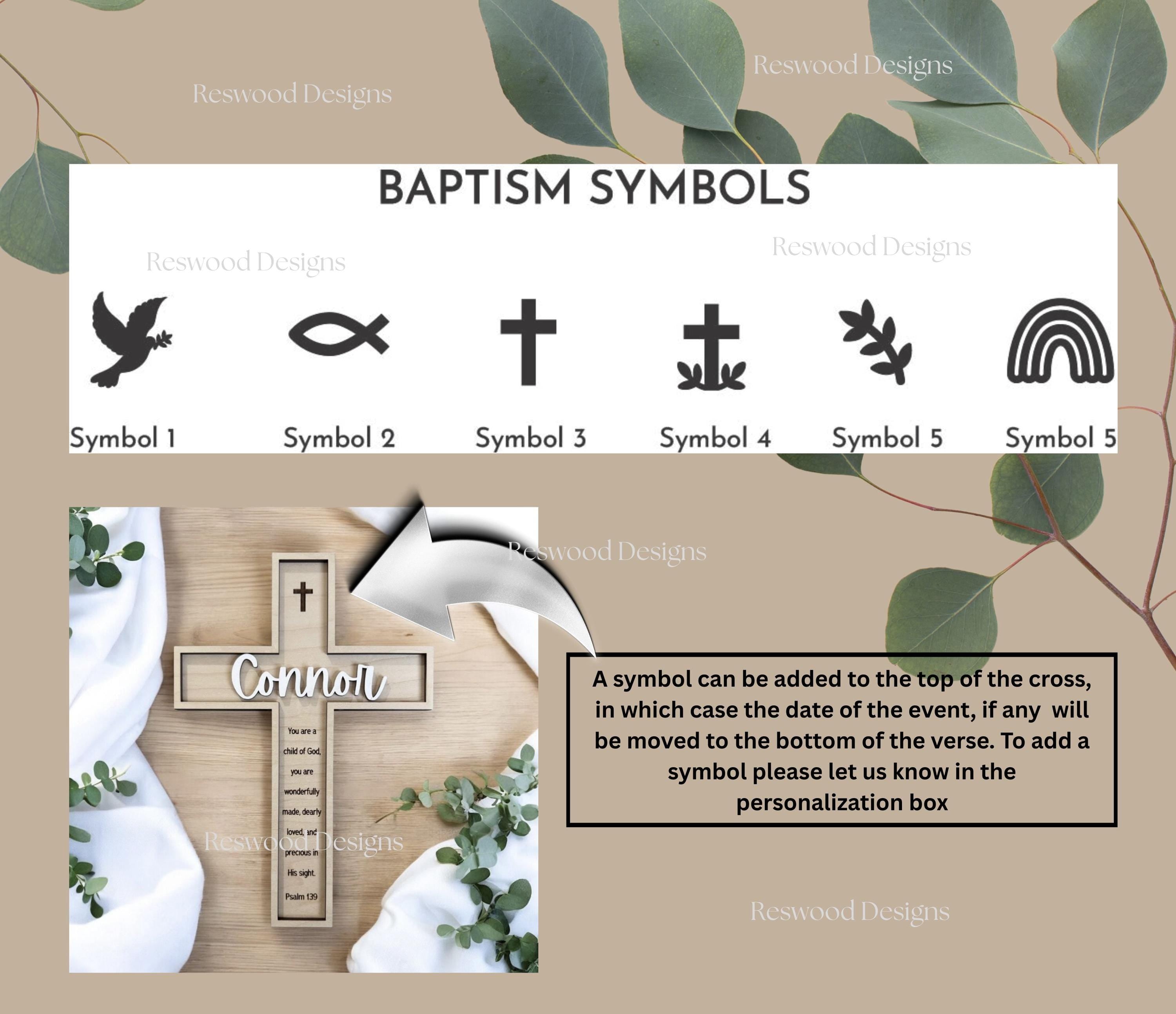 This is a handcrafted decorative wooden cross, made from two layers of laser-cut maple wood with a 3D appearance. The bottom layer is natural wood with a laser-engraved verse, and the top layer includes a name and outline attached for a raised effect. Optional baptism symbols can be added to the top of the cross.