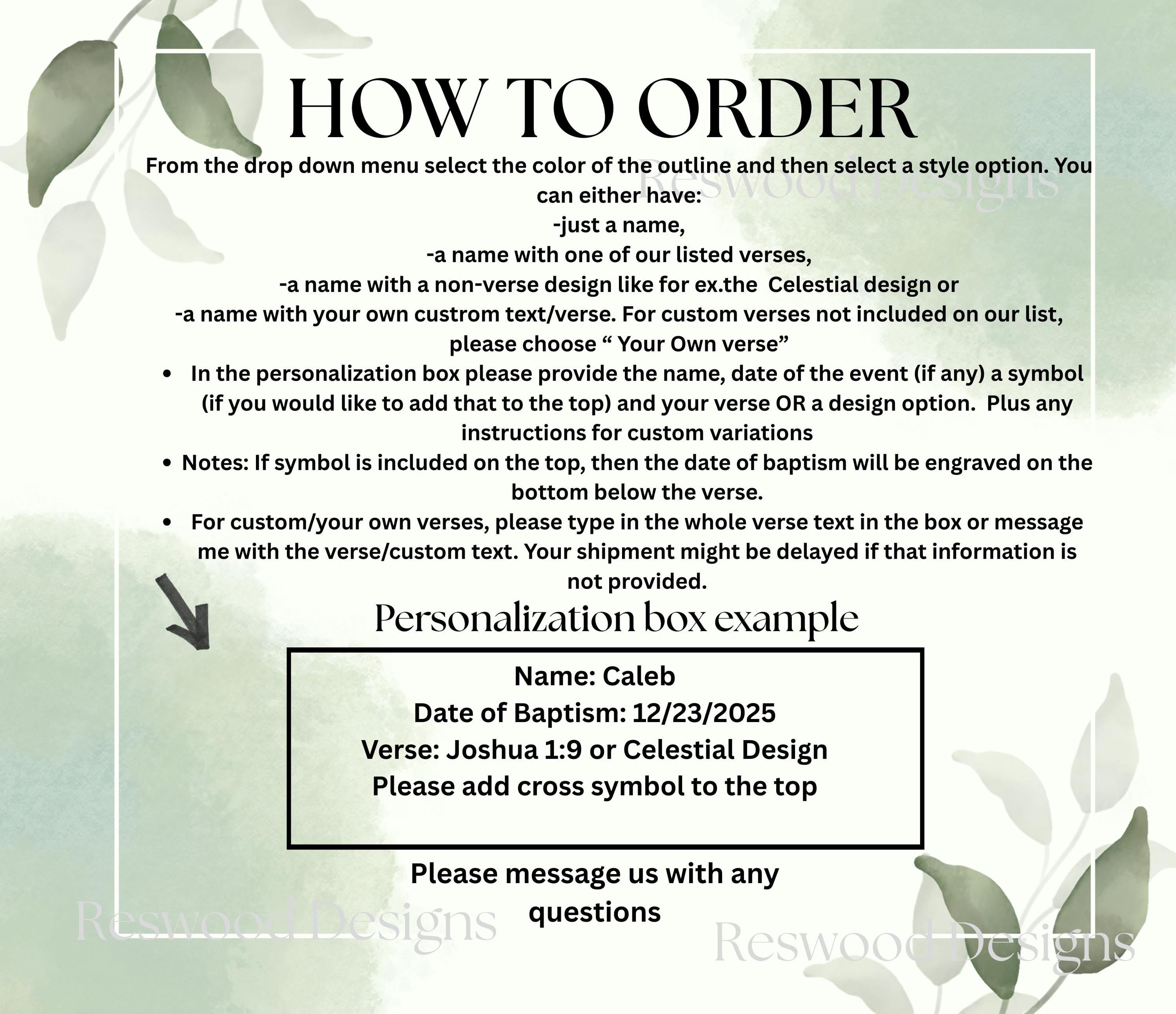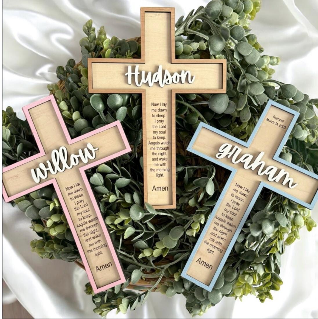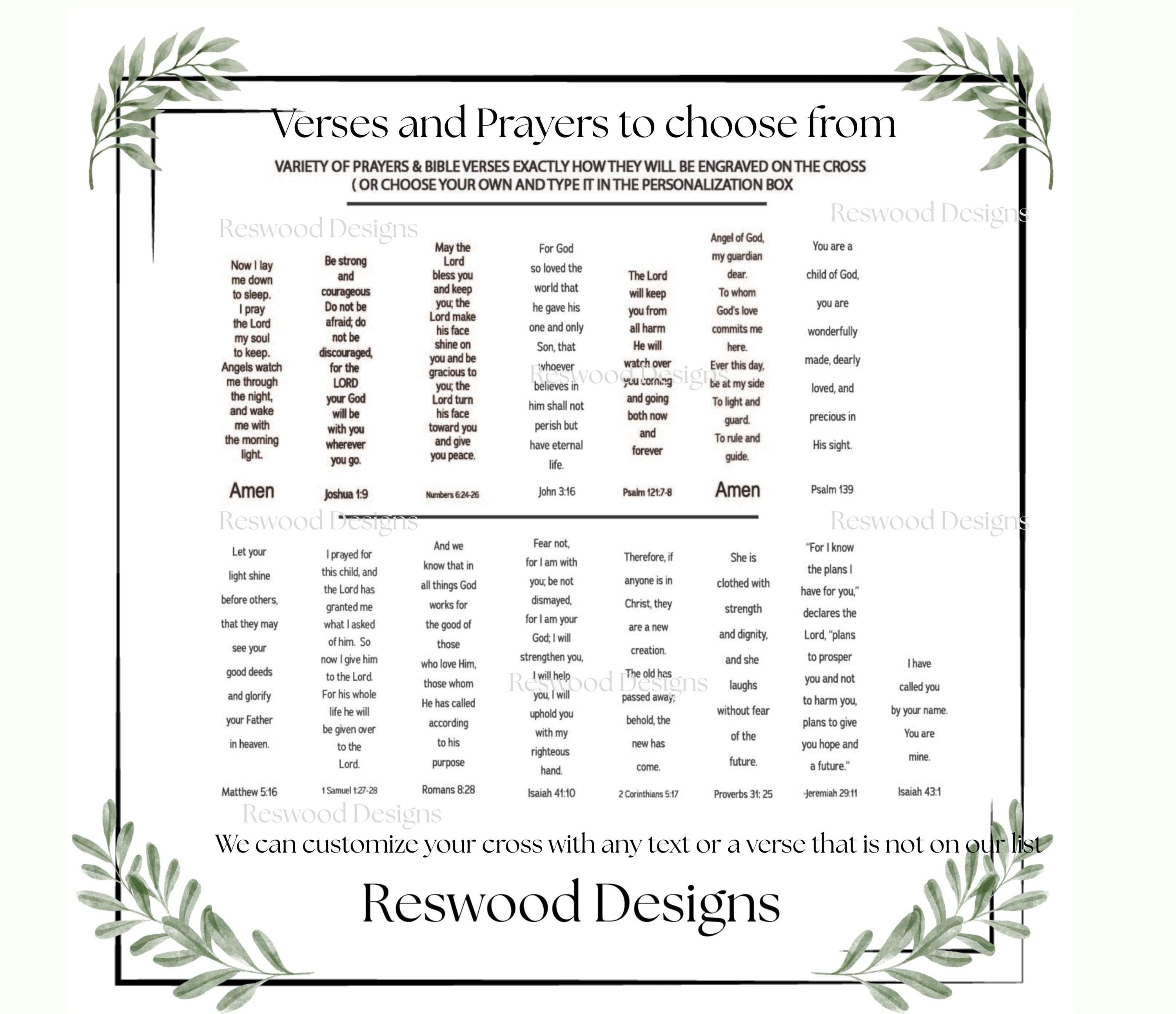 This is a handcrafted decorative wooden cross, made from two layers of laser-cut maple wood with a 3D appearance. The bottom layer is natural wood with a laser-engraved verse, and the top layer includes a name and outline attached for a raised effect. Optional baptism symbols can be added to the top of the cross.
