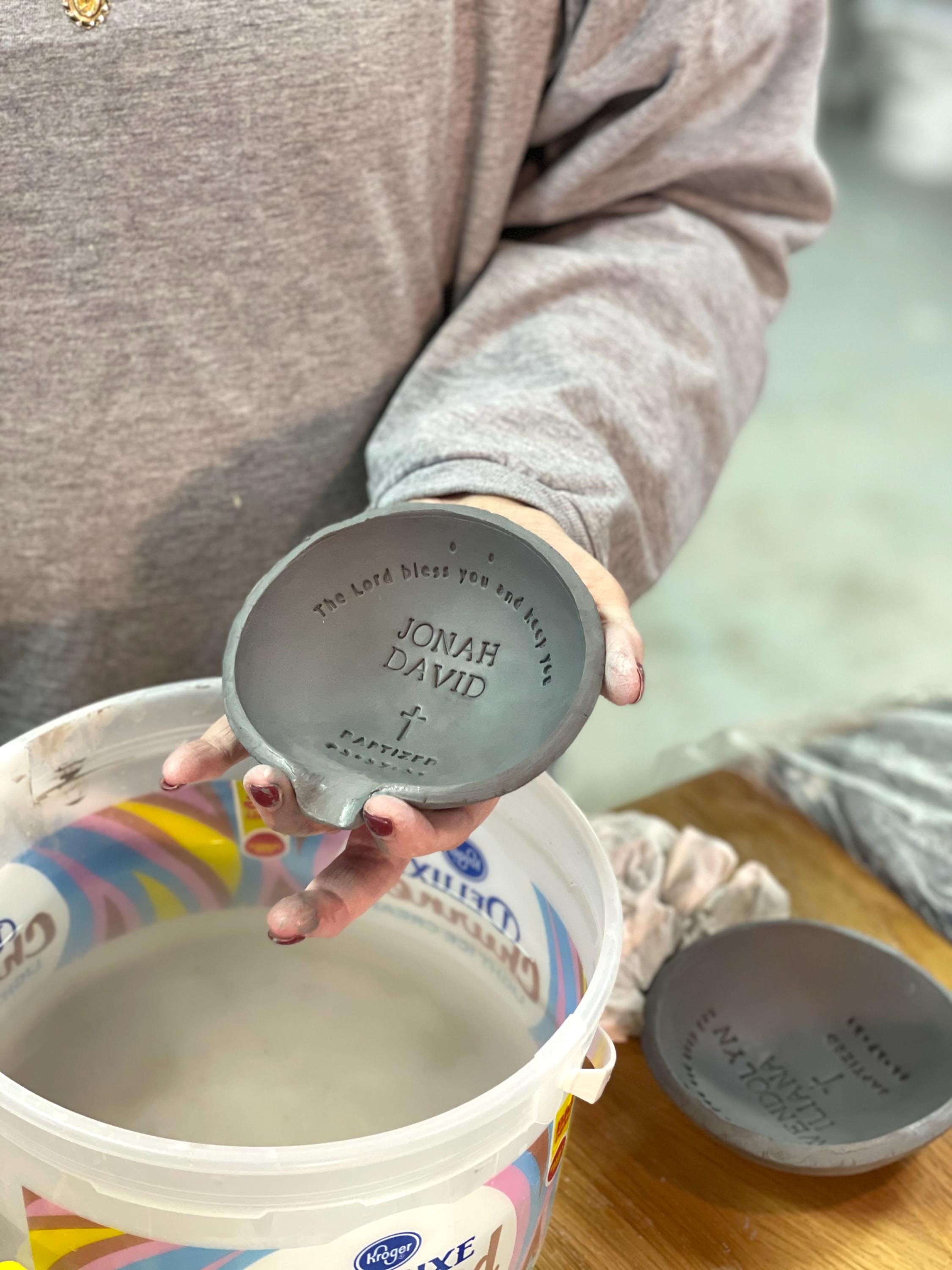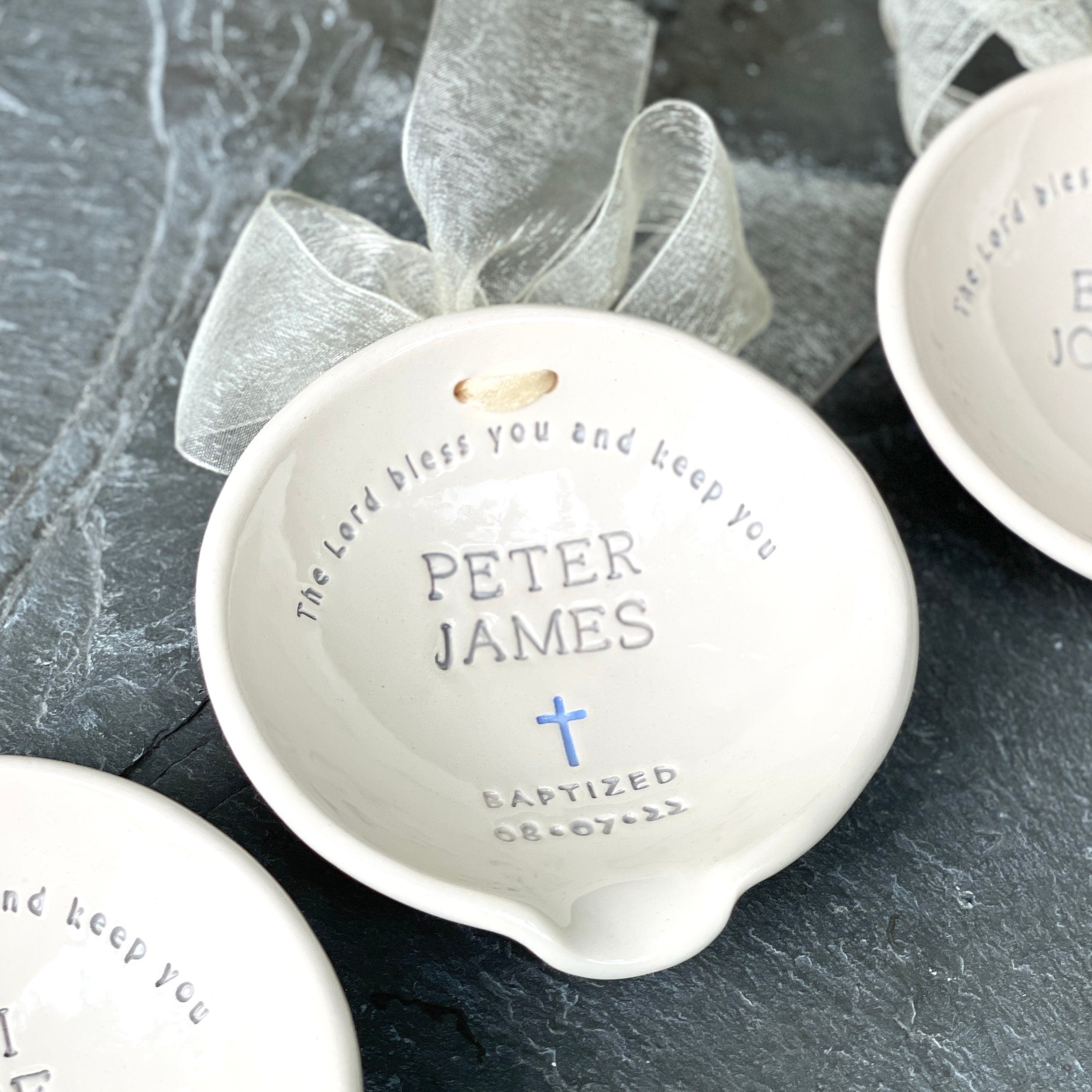 This is a handcrafted baptism bowl, designed as a meaningful keepsake for baptism ceremonies. It can be used during the ceremony to pour baptismal water and later kept as a decorative or commemorative item.