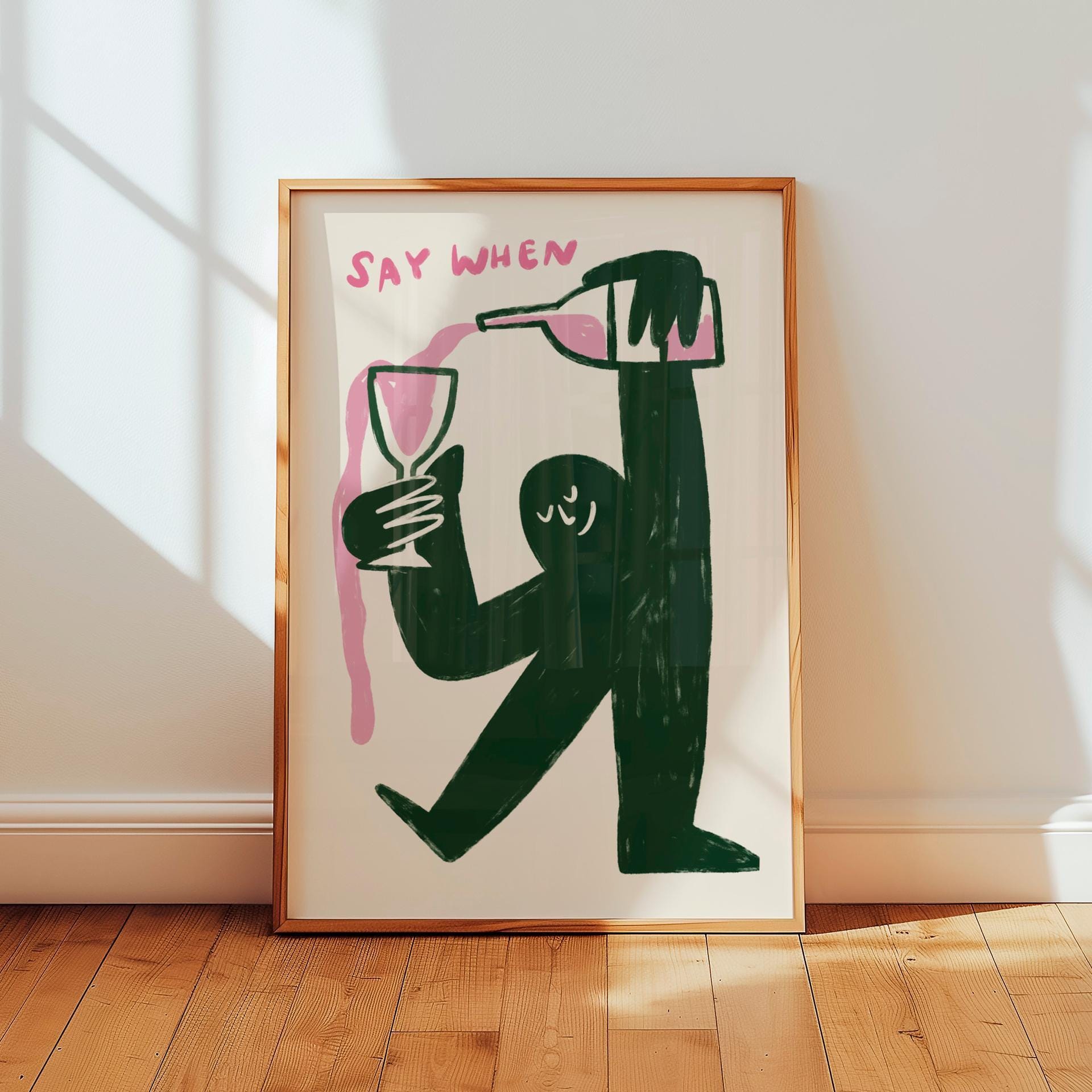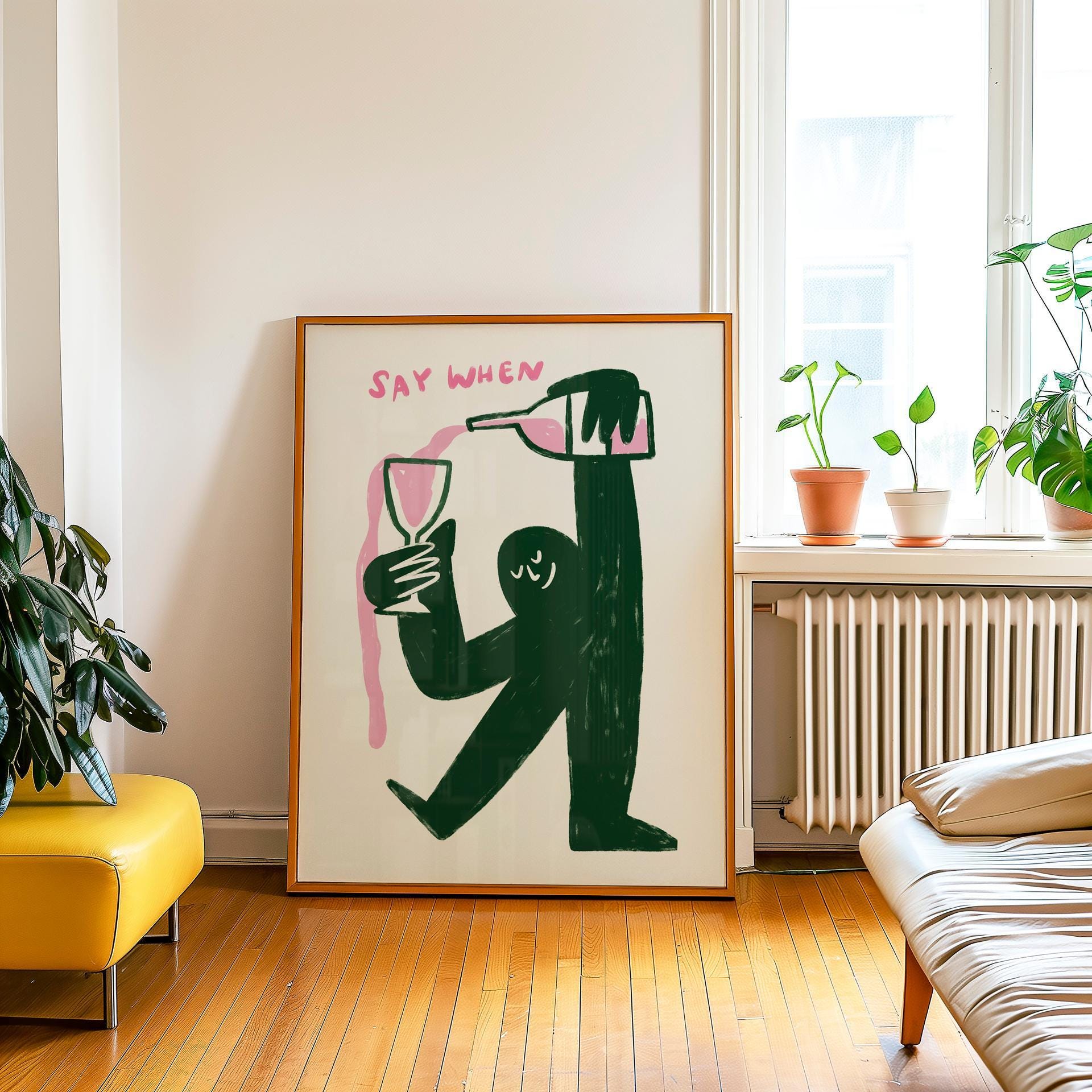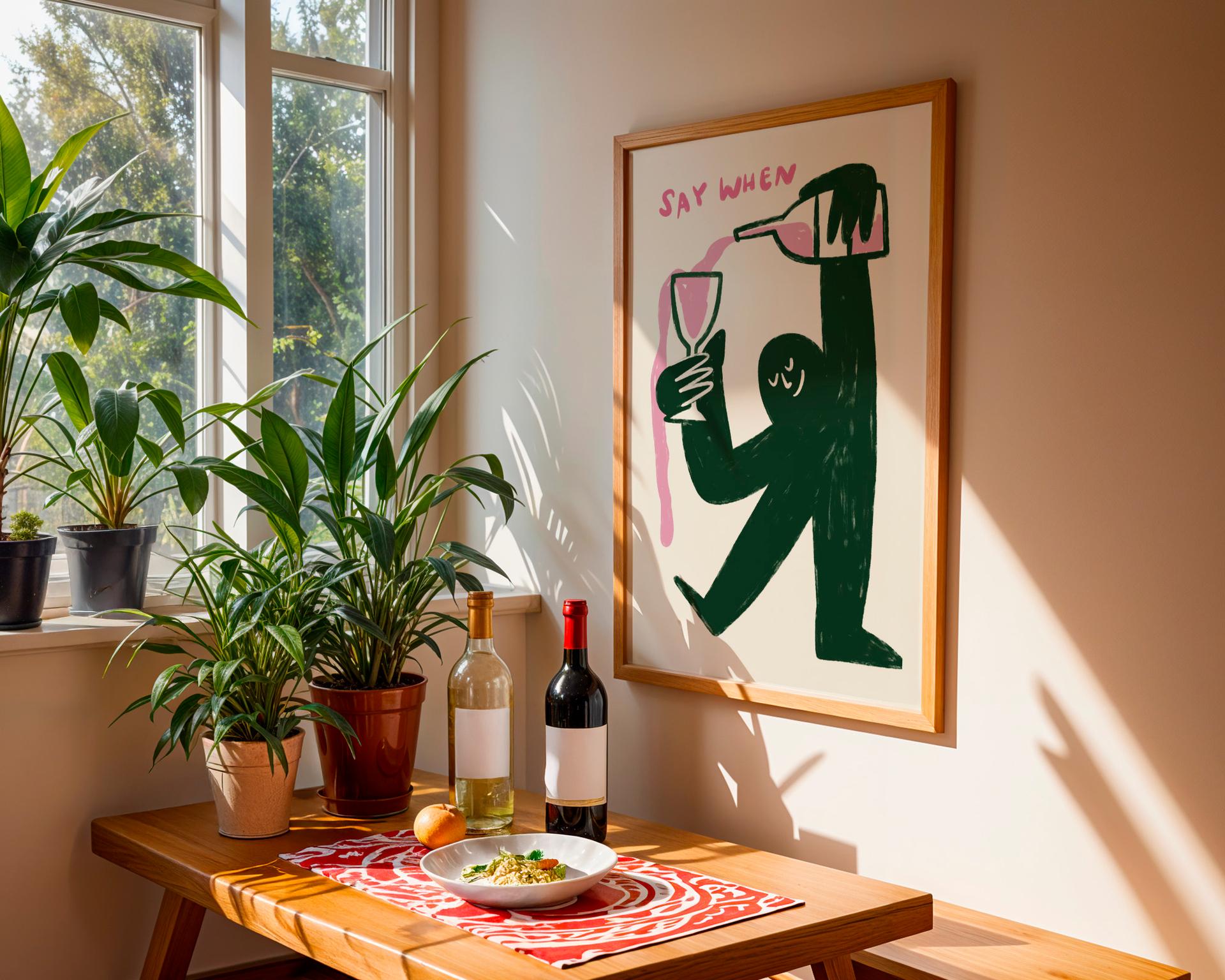 Looking for a fun statement piece for your kitchen or bar area? This quirky wine art print features a playful character pouring wine endlessly with the text "say when," adding both humor and style to your space. Perfect for a kitchen wall, home bar, wine room, or as a housewarming gift that will make everyone smile.