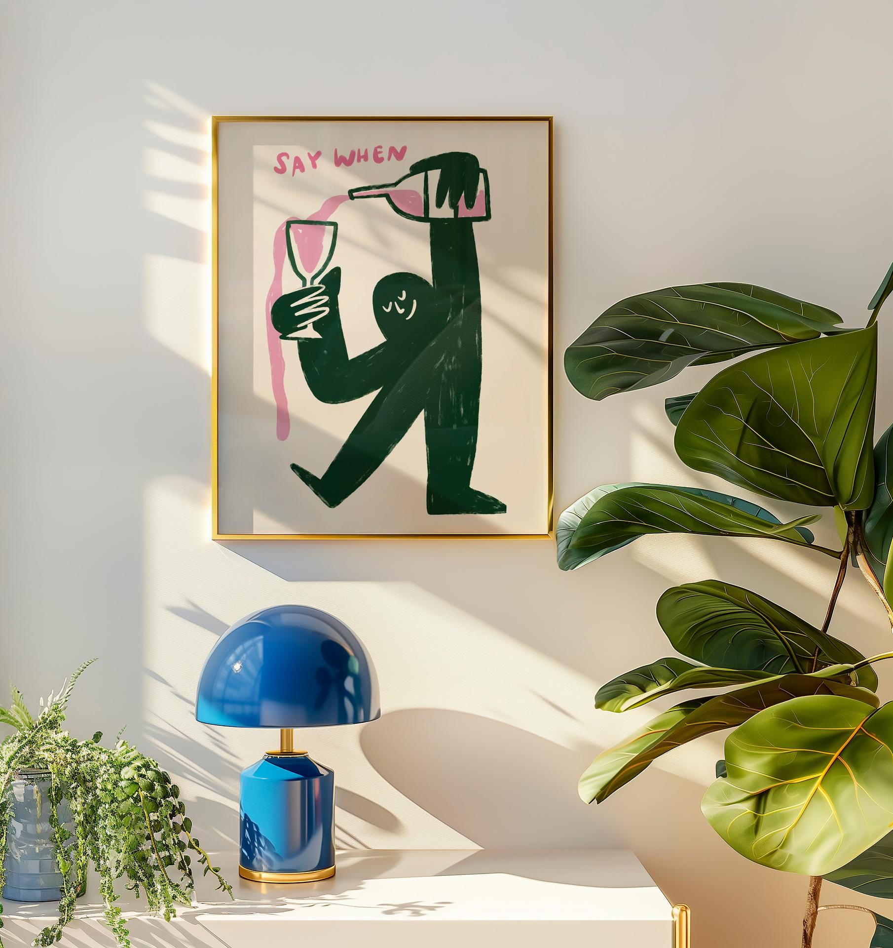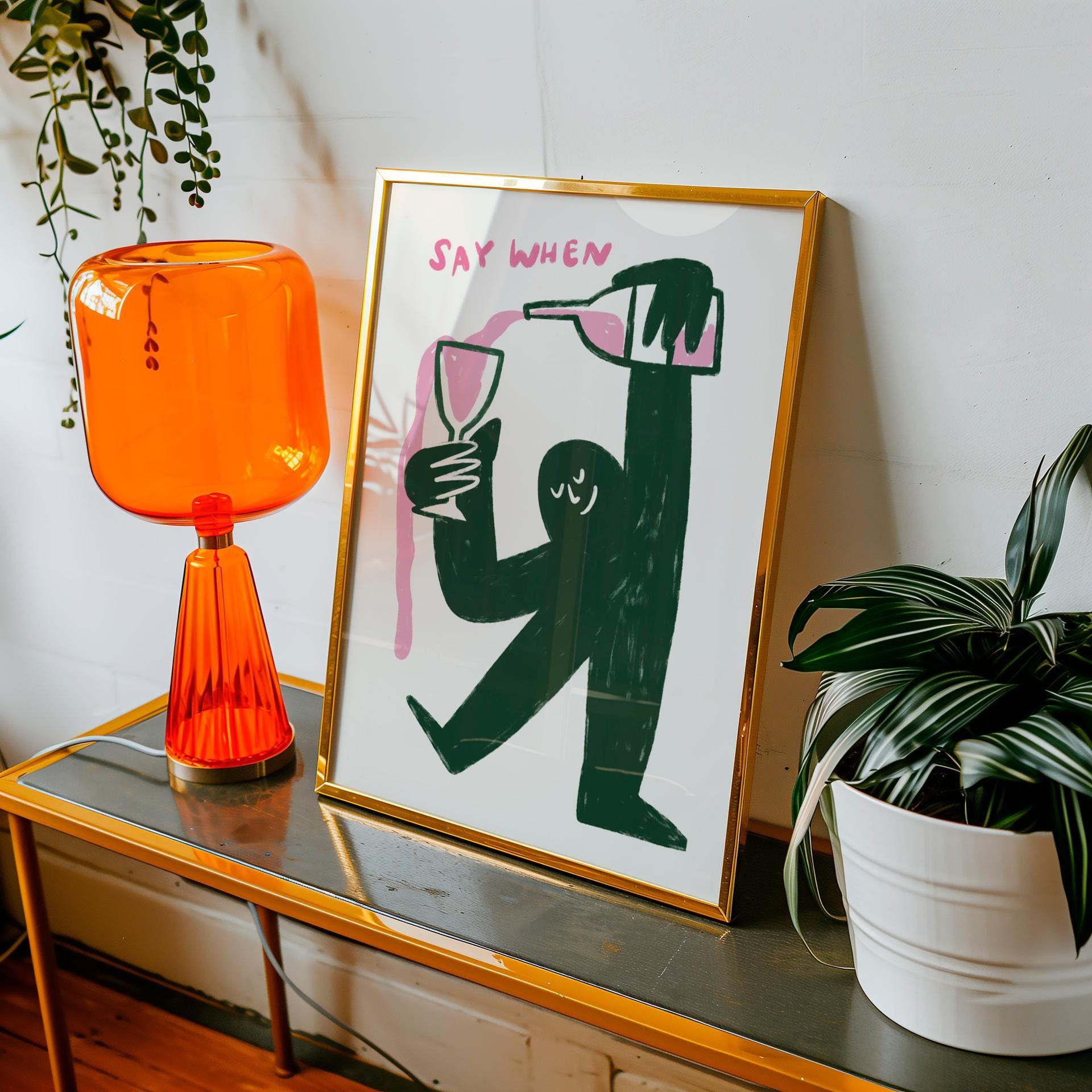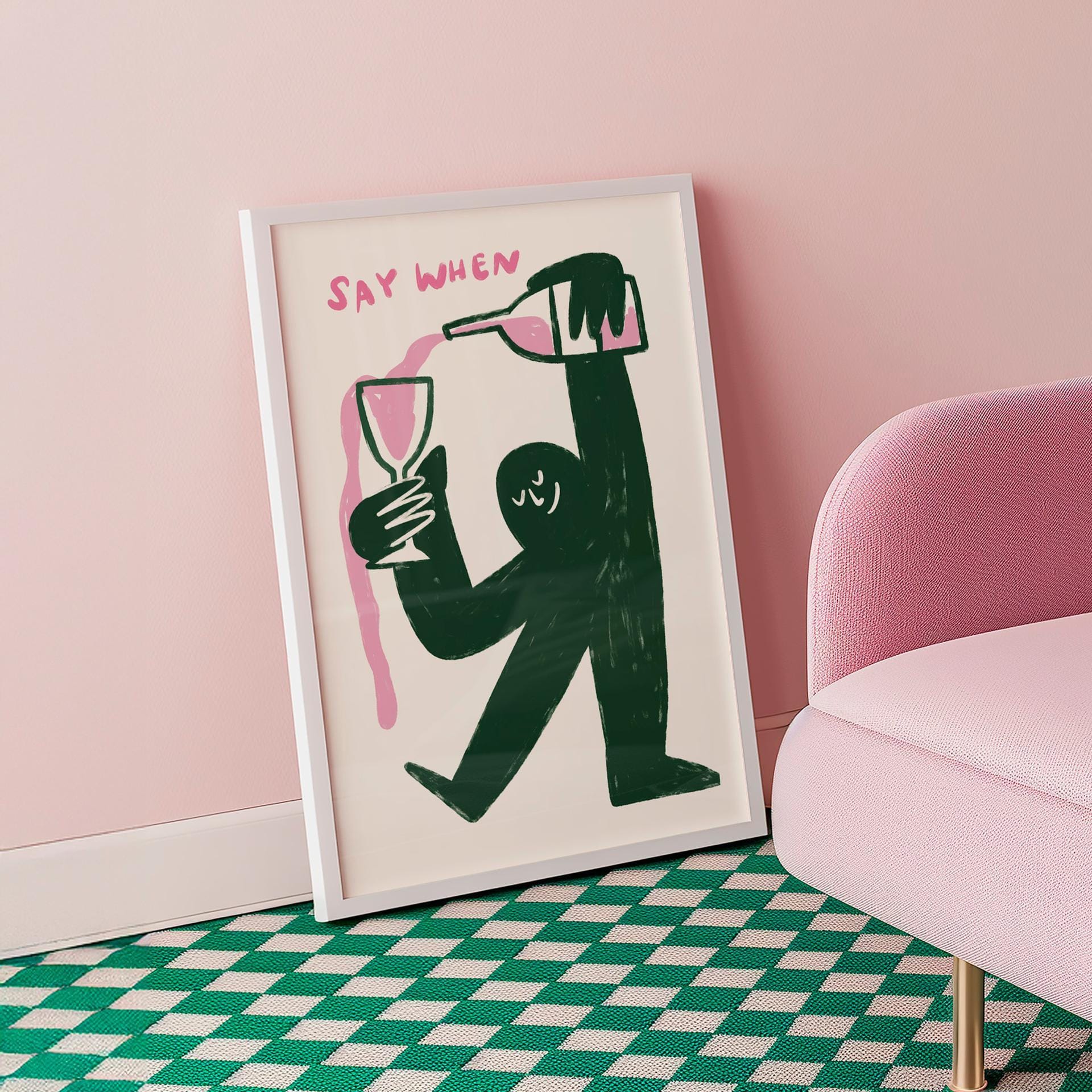 Looking for a fun statement piece for your kitchen or bar area? This quirky wine art print features a playful character pouring wine endlessly with the text "say when," adding both humor and style to your space. Perfect for a kitchen wall, home bar, wine room, or as a housewarming gift that will make everyone smile.
