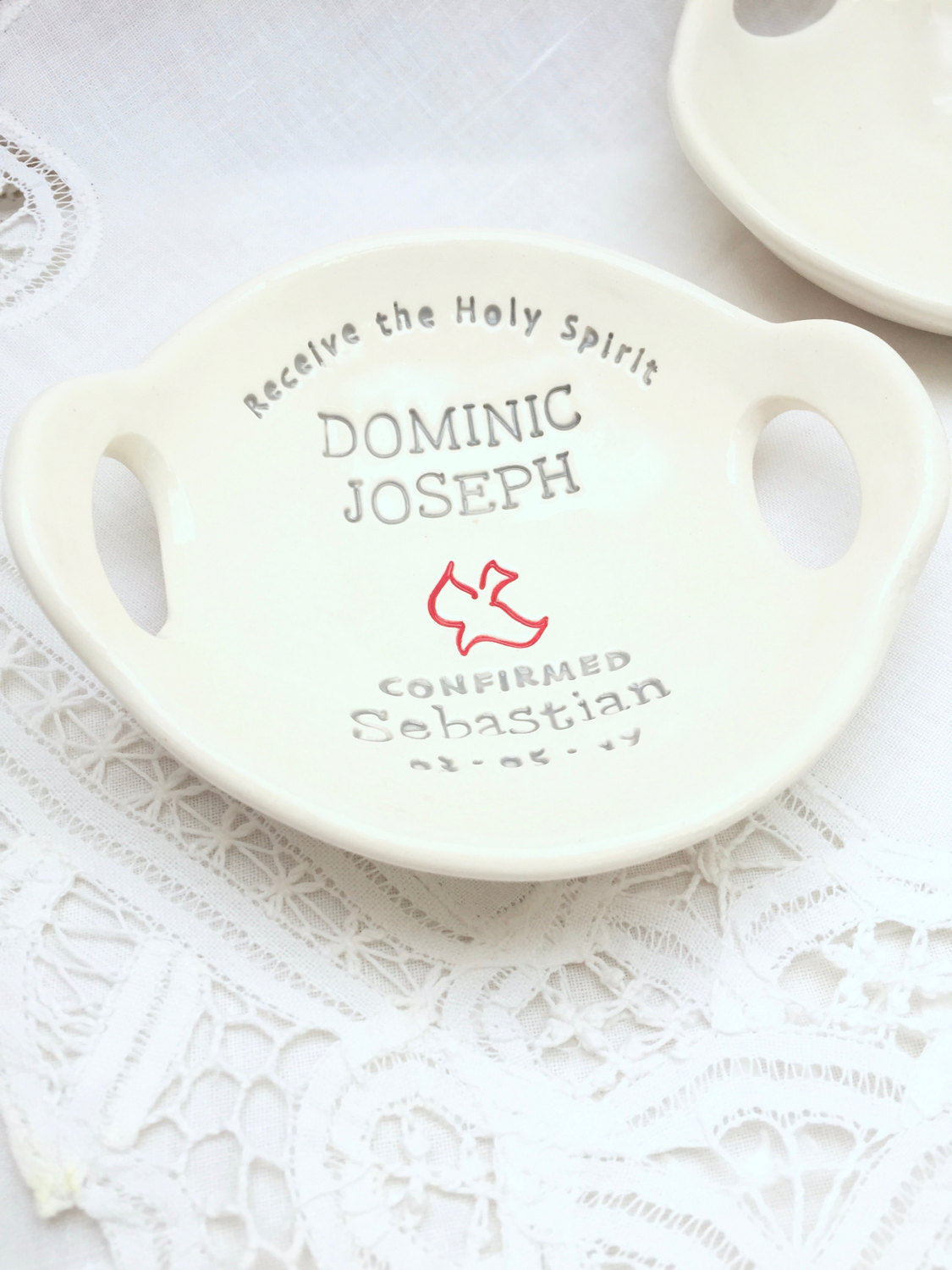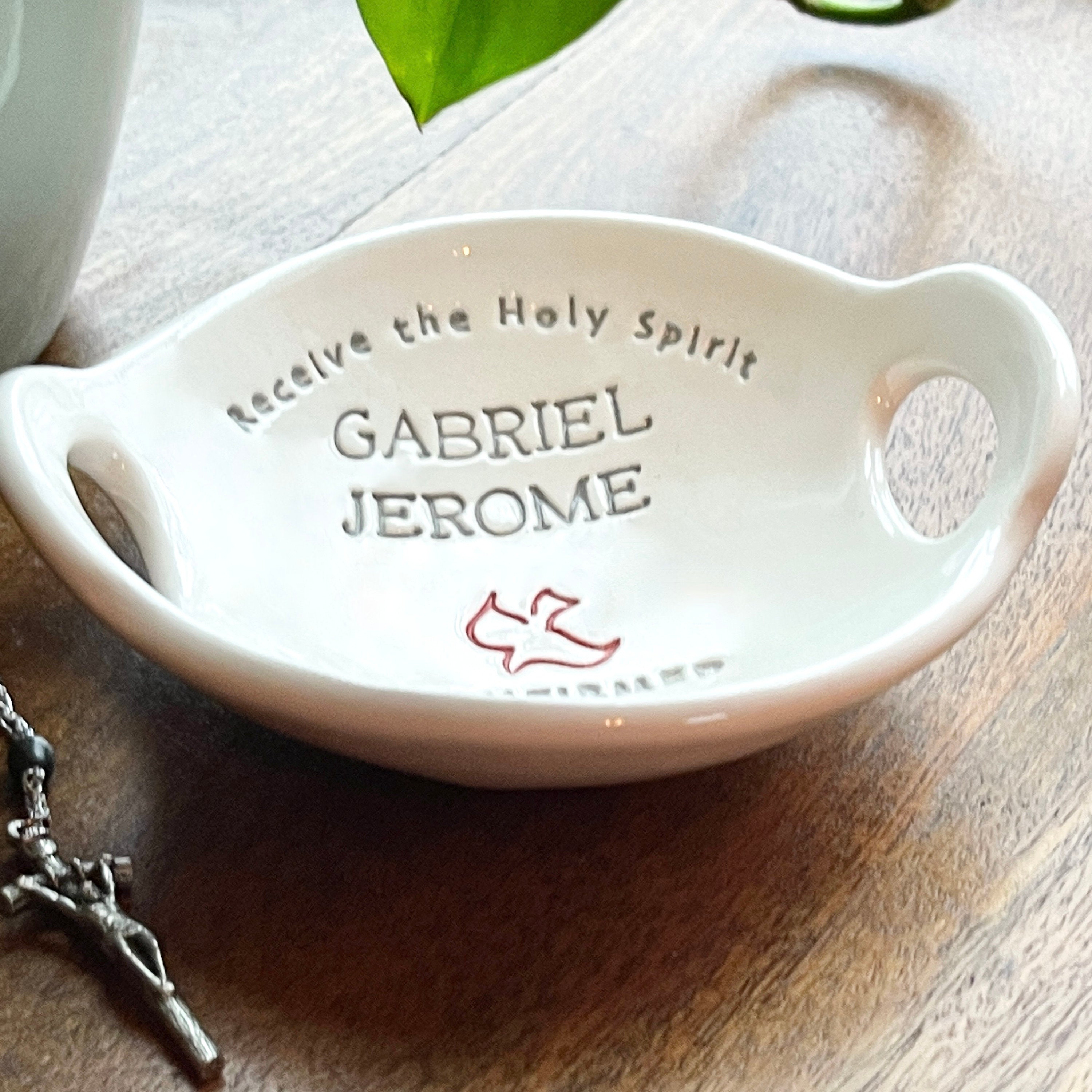 This is a custom Confirmation bowl, designed as a meaningful keepsake to mark the important step of Confirmation. It can hold a rosary, rings, loose change, or other small items, making it both functional and commemorative.